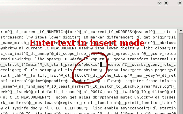 Now switch to insert mode in the text editor by pressing INSERT. Now write your name or any particular text any where in the screen full of text. Save the file and close the window.