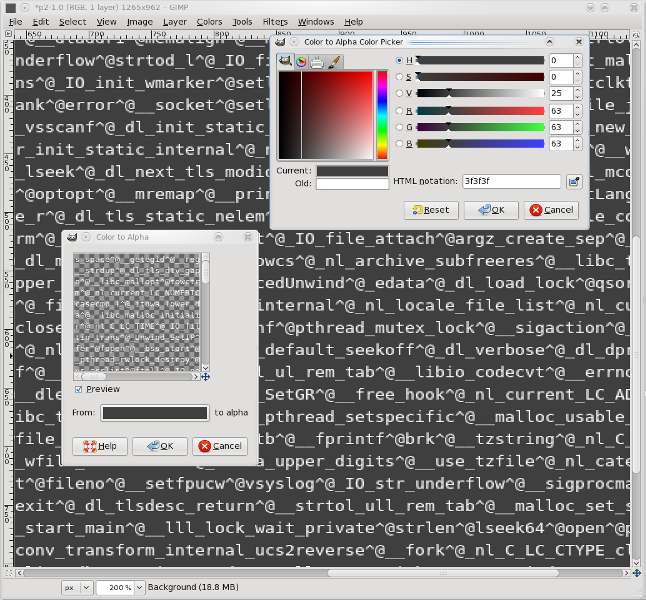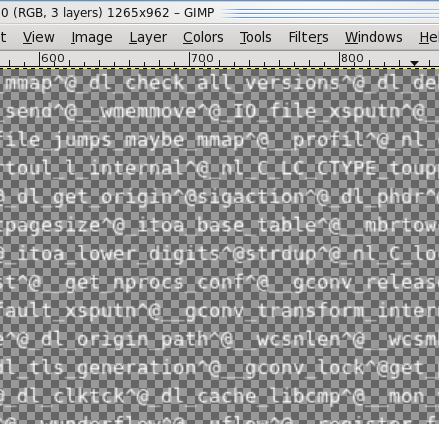 I just made a code wallpaper in GIMP ! Although i am not an expert in GIMP i am trying to write up how i made it. This is a guide on how to make a geeky code wallpaper showing a screenful of code with your name highlighted. The screenfull of text in this guide is the ASCII characters of a statically linked ELF binary file, who’s bottom section has a screenfull of text. You could modify with your favorite code or even other texts, like your name peeking out of a randomly generated screenfull of string. Continue reading, and check out the guide.