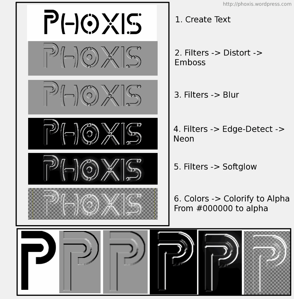 The first step will emboss the text, next we blur the text, this is needed for the next step. When Neon edge detecting the sharp color transitions will get white, in this case the edges would get white. edges of the text will remain. If this layer was not blurred then the neon edge detection would result in jagged edged, and bad looking fonts instead of smooth edges. The Azimuth will control the white lining of the texts when applying Neon edge detection. Here you can do some research to get the white text outline as per your need. Then the layer is sharpened to compensate the blur. The softglow is applied to make a glowing effect of the text, so not apply too much of it, even it will look good when working, at some later time too much soft glow looks very bad. Then we select the text and crop only the text area. Note carefully when embossing, the values are very important which actually set how the text will look. Then apply the colorify to alpha and make the black background to alpha. And that’s it you get the basic glass text.