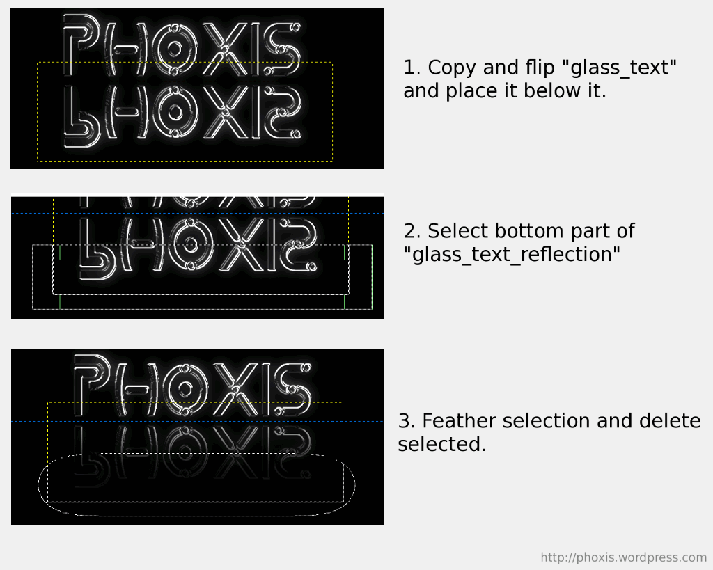 • With the Rectangle Selection tool select an area, such that 40 to 50 percent of the lower part of the “glass_text_reflection” layer is inside the selection. Now feather the selection with a good high value of about 200 to 250 pixels.