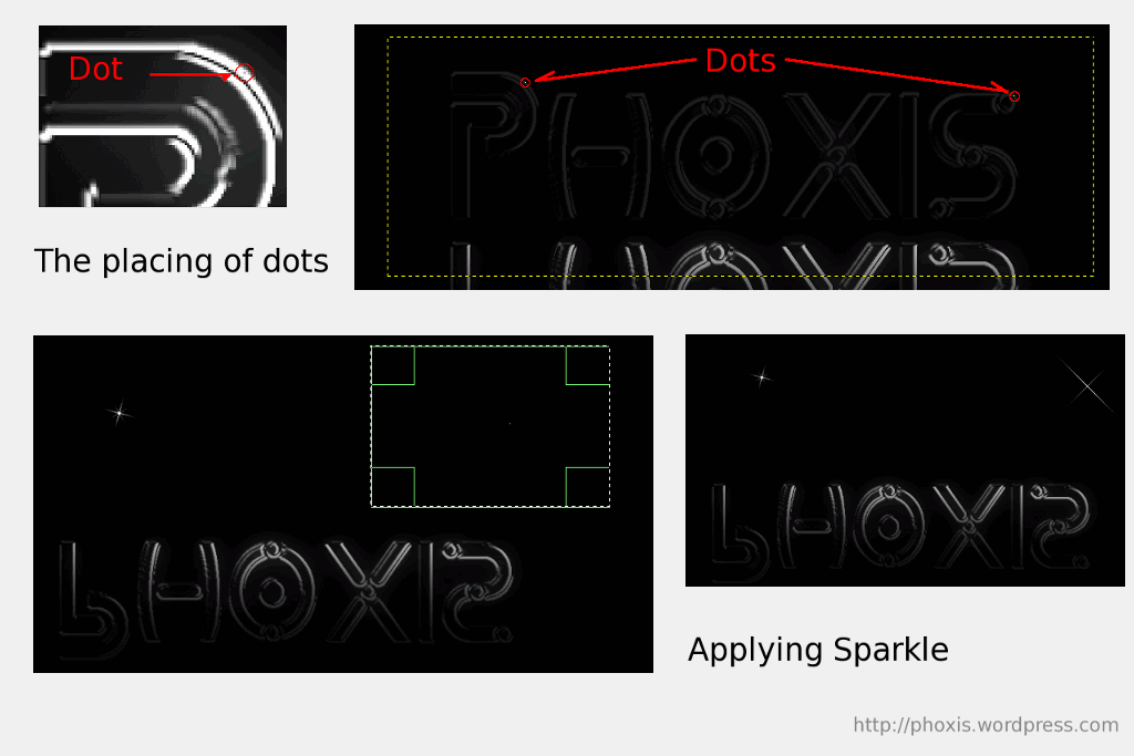 Here we will make the text sparkle in 2 (or 3) places of the text. We will draw the sparkles in the brightest edges of the text. We will make a small (1pixel) spot on a transparency layer as if that it is on the glass text font, and then make the spots sparkle.