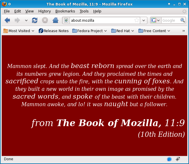 Type in about:robots in the address bar. This will show you the book of Mozilla. Different versions will show different editions. There is no book named “The Book of Mozilla”, this is simply fun, containing quotations from different places. In firefox3 you can see the 11:9 , 10th edition. Check out here in Wikipedia for more: http://en.wikipedia.org/wiki/The_Book_of_Mozilla